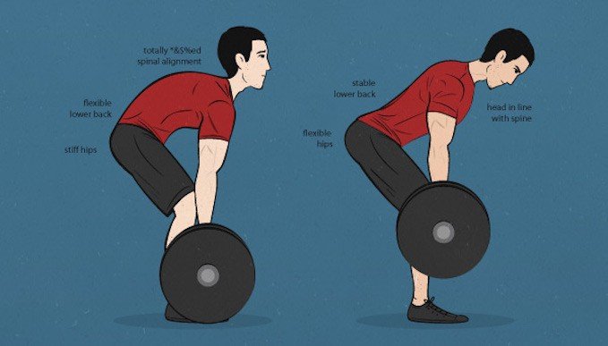 The deadlift-er on the left will move his spine from this flexed position to an upright position. The distance that his spine moves will result in a large amount of work for the spine to perform. The deadlift-er on the right is generating the movement from his hips. The spine is straight; there will be no movement in his spine as he becomes upright.